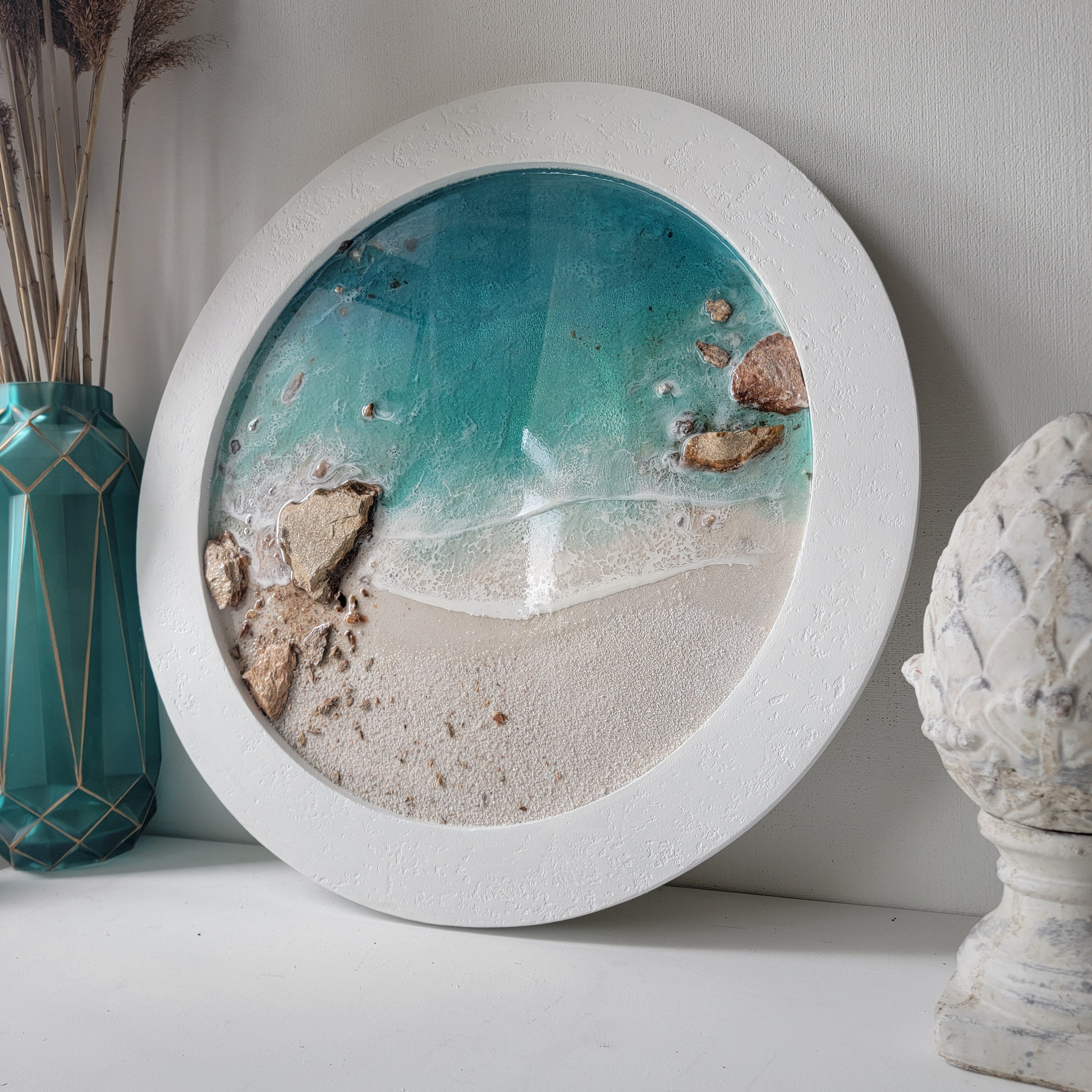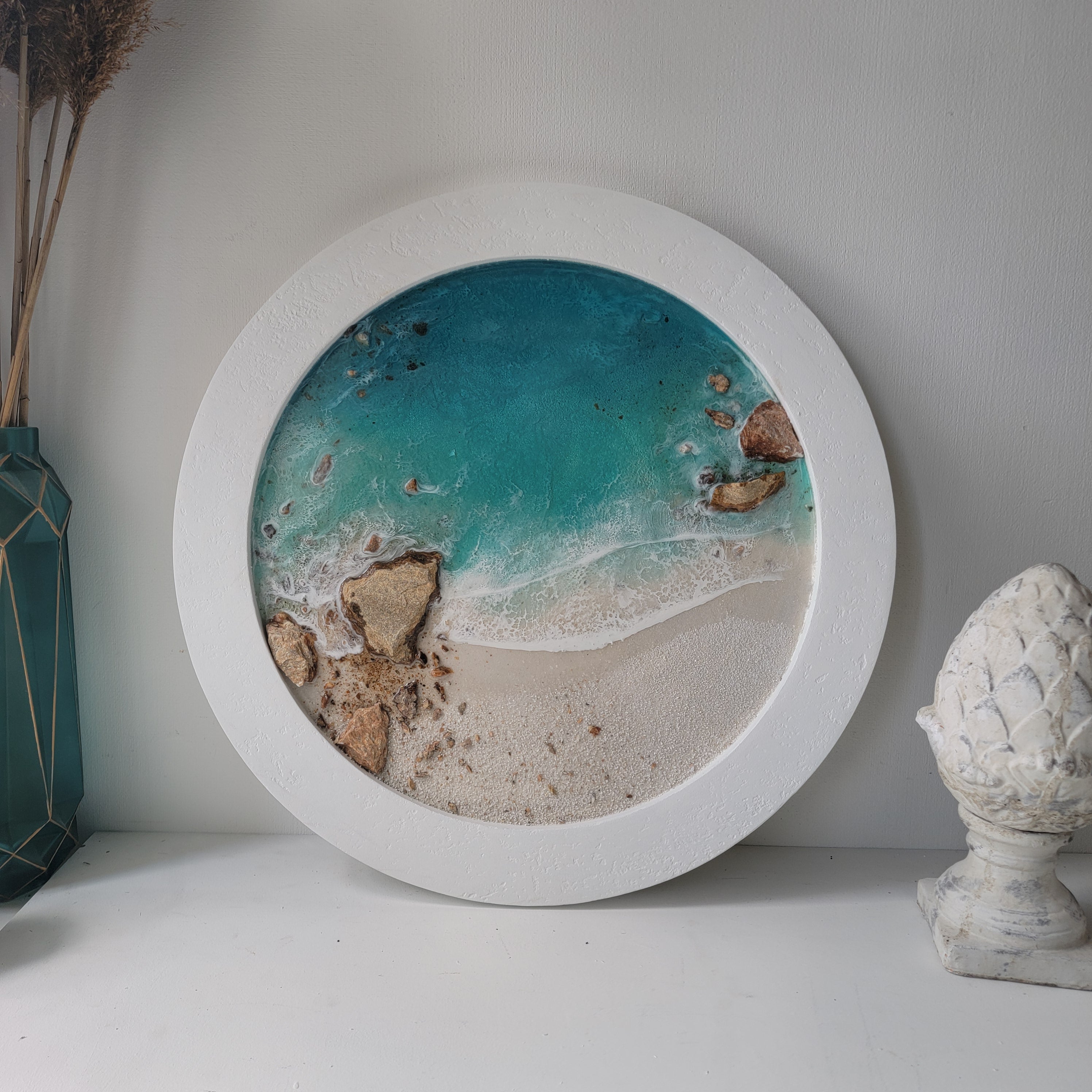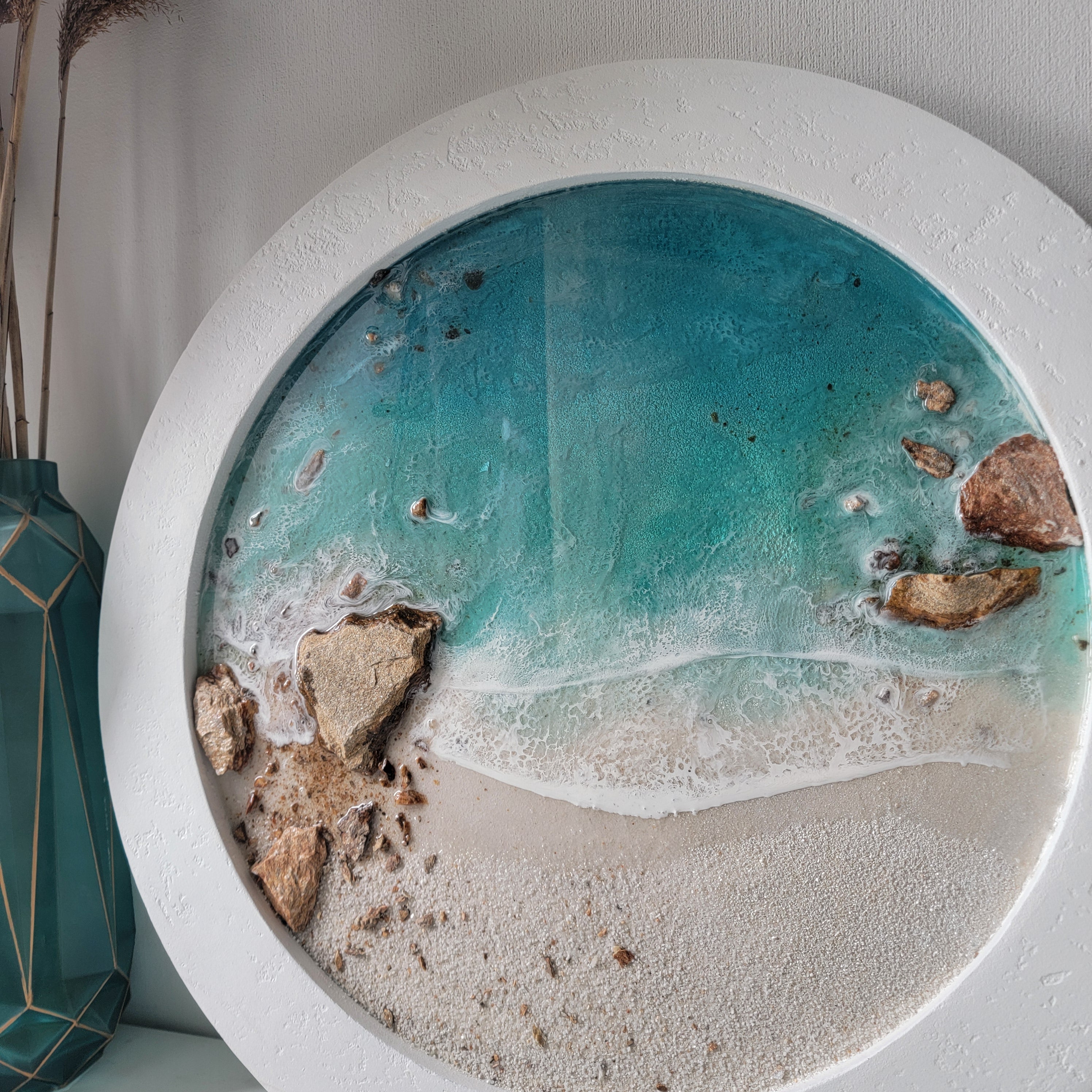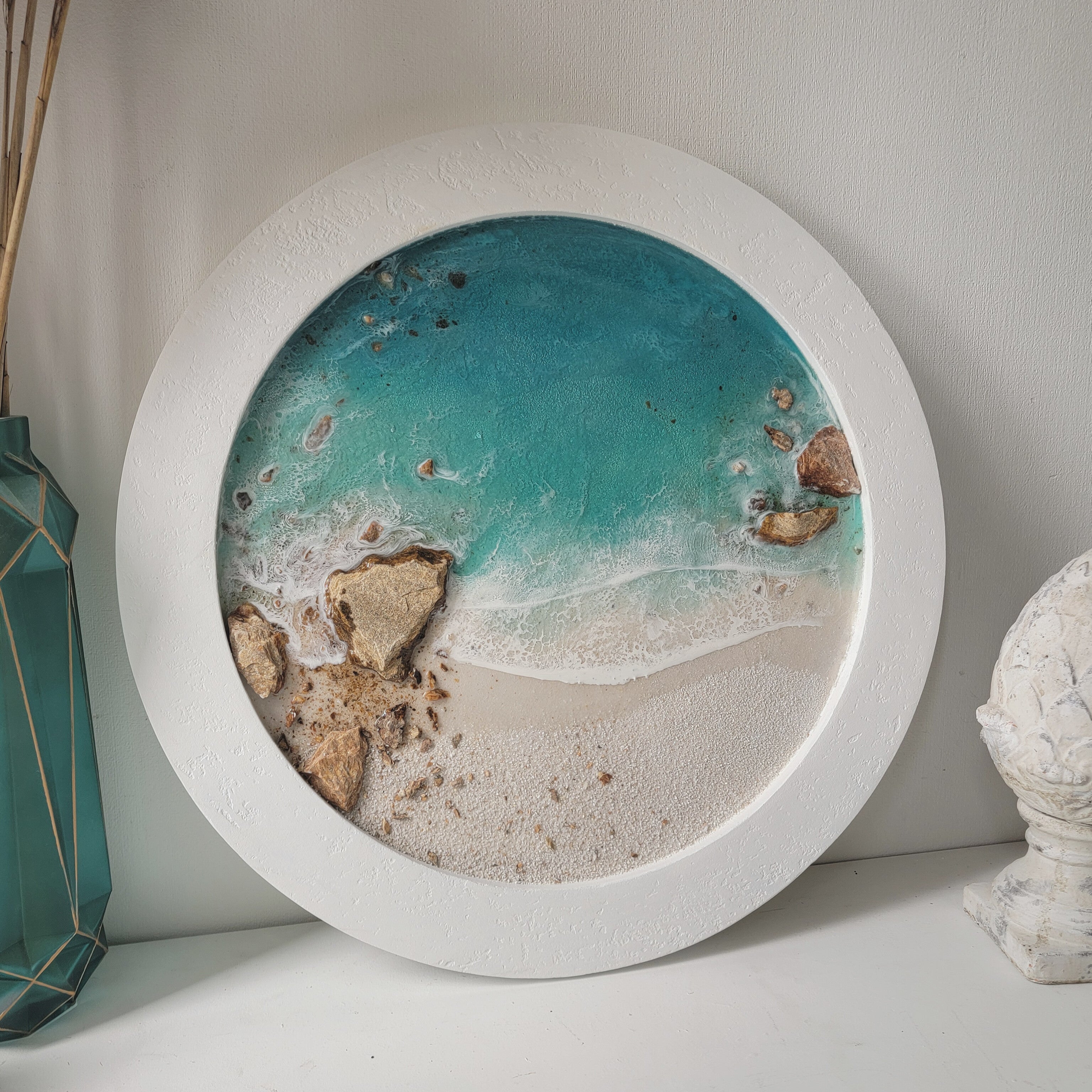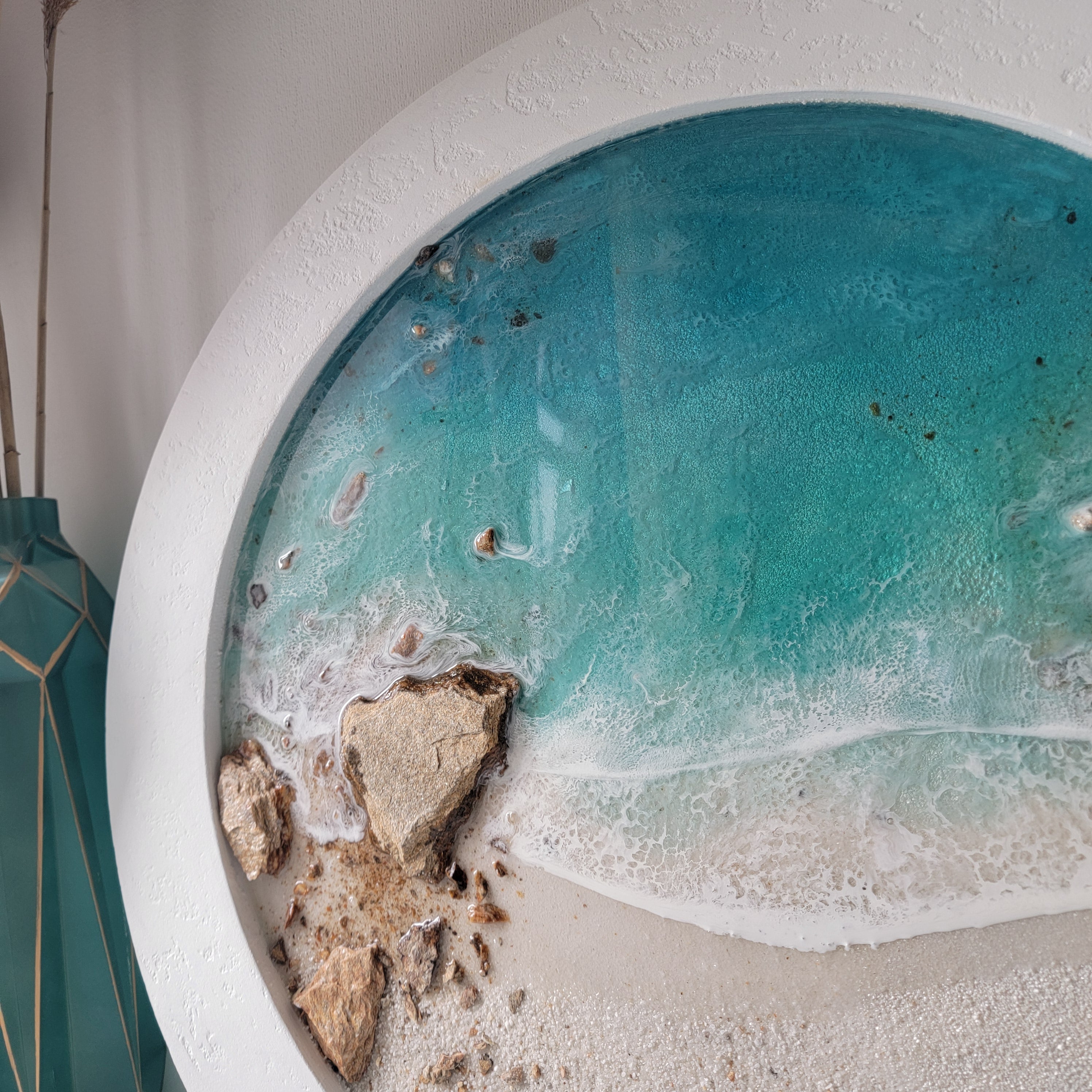 This one-of-a-kind work of art will transport you to a peaceful ocean paradise with its calm colors and calming textures.